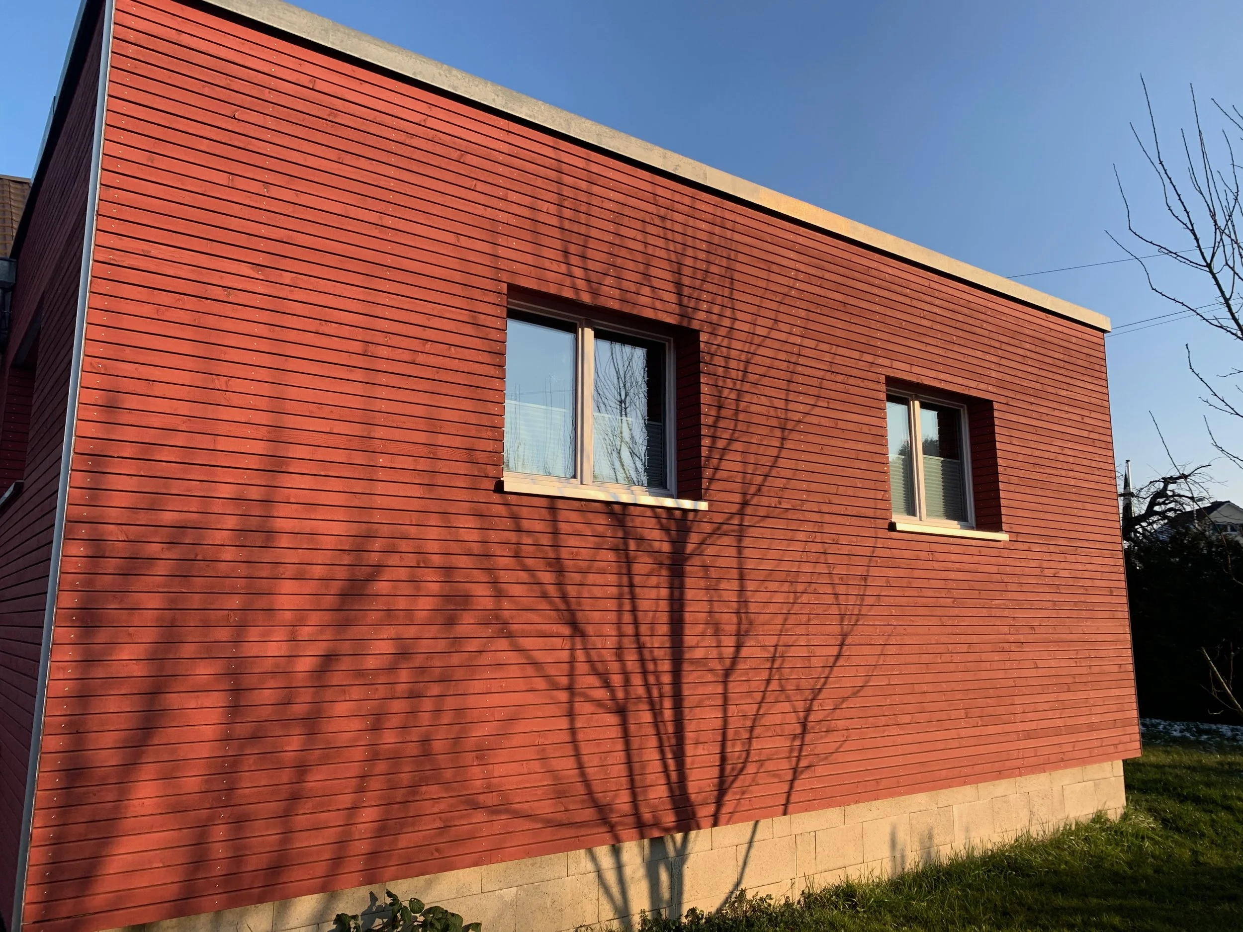 Wohnraumerweiterung von 41 m2 komplett in Holzbau was eine schnelle Fertigstellung ermöglicht, da keine Trocknungszeiten entstehen. Ideal wenn das Haus gleichzeitig bewohnt ist. Auch im Innenausbau und der Fassade wurde mit einem geölten Parkett, der Massivholzdecke und einer Rhomboide-Schalung auf den Werkstoff Holz gesetzt.