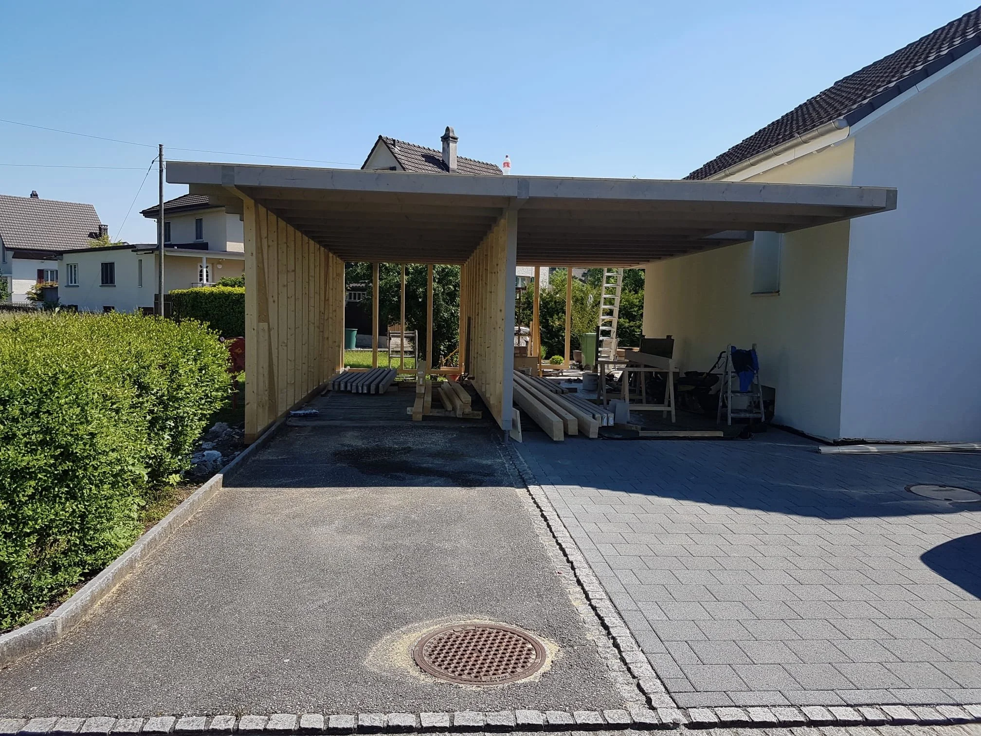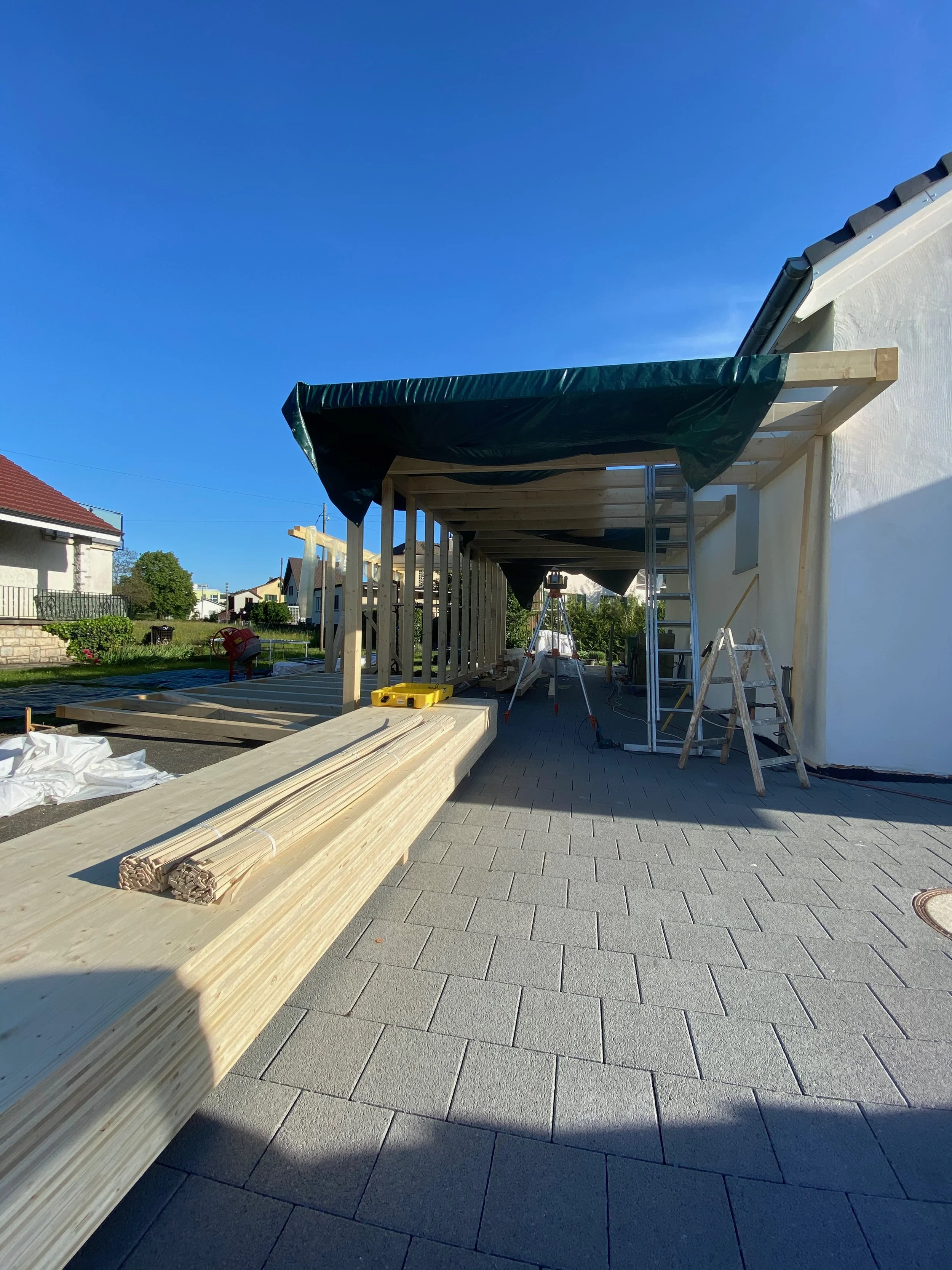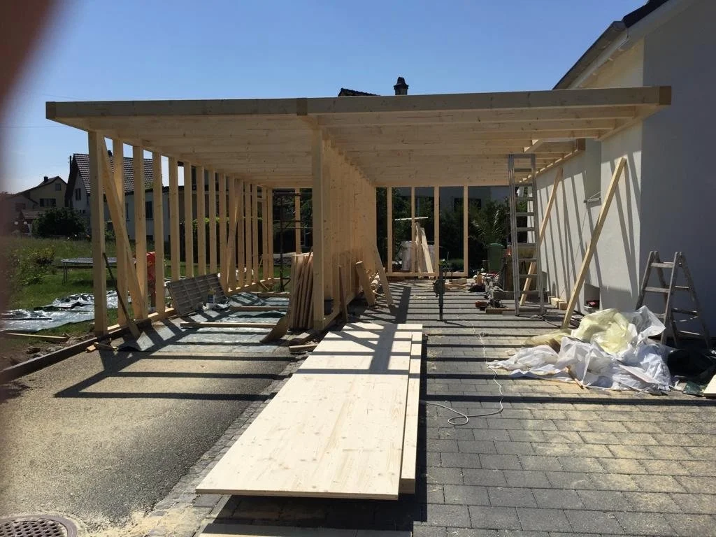 Hier entsteht ein Doppel- Carport nach individuellen Wünschen zweier Wohnparteien. Auf der linken Seite ein Parkplatz mit Geräteschopf der auch vom Garten aus erreichbar ist. Rechts Platz für 2 Fahrzeuge hintereinander.